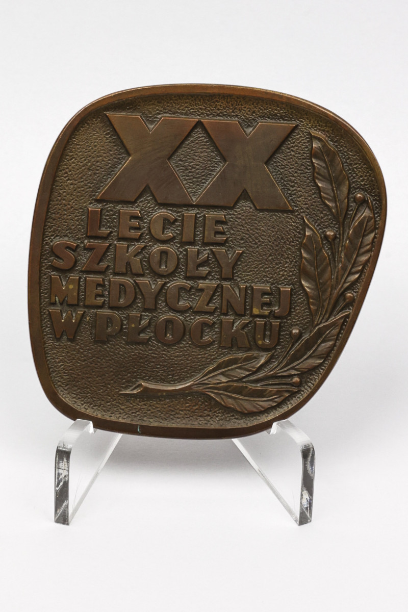 Pamiątkowy medal o nieregularnym kształcie wydany z okazji 20 lecia Szkoły Medycznej w Płocku