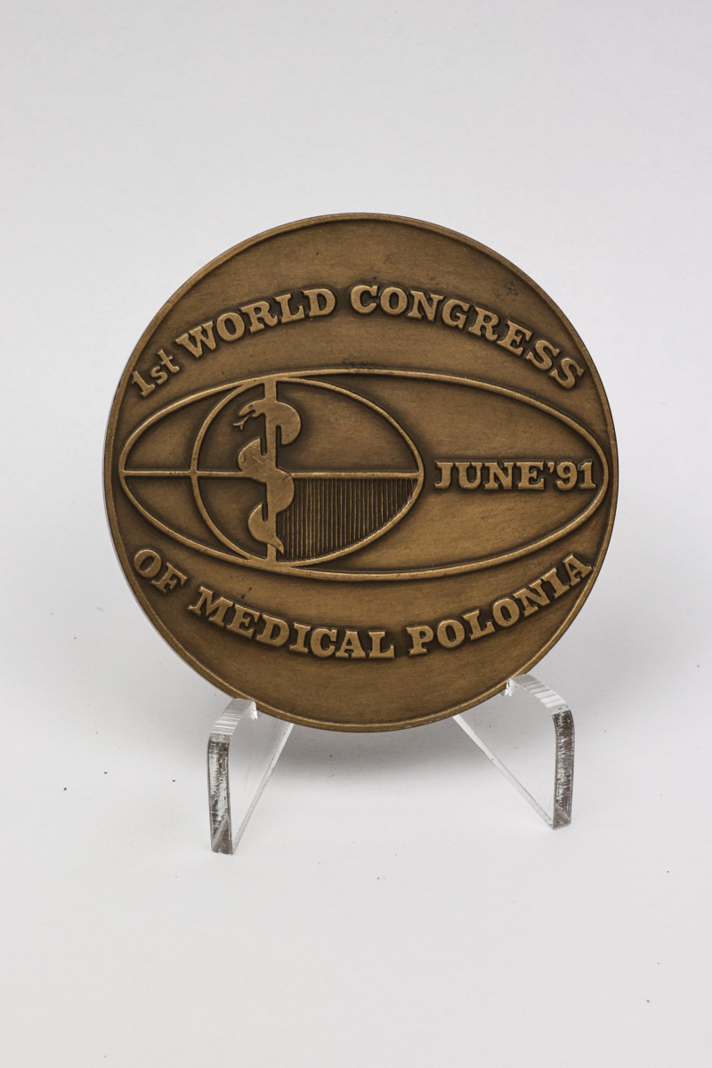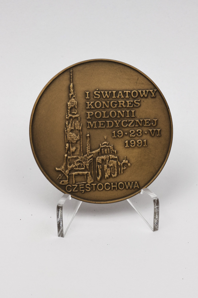 Pamiątkowy medal wydany z okazji I Światowego Kongresu Polonii Medycznej, który odbył się w dn. 19-23 czerwca. 1991 r. w Częstochowie Napis na rewersie : 1 st of Medical Polonia World Congress June’91. Medal brązowy, średnica 7 cm