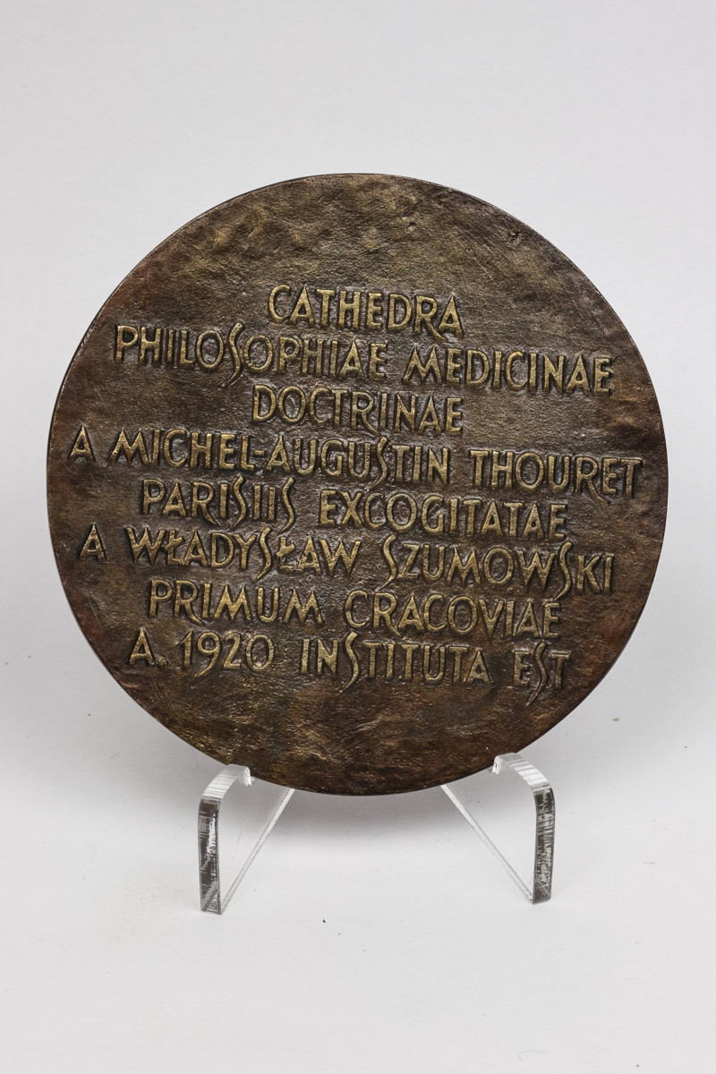 rewers: napis: CATHEDRA PHILOSOPHIAE MEDICINAE DOCTRINAE A MICHEL-AUGUSTIN THOURET PARISIIS EXCOGITATAE A WŁASDYSŁAW SZUMOWSKI PRIMUM CRACOVIAE A. 1920 INSTITUTA EST (tł.: Myśl Michela-Augustina Thoureta powołania katedry filozofii medycyny w Paryżu, została zrealizowana w 1920 r. przez Władysława Szumowskiego w Krakowie)