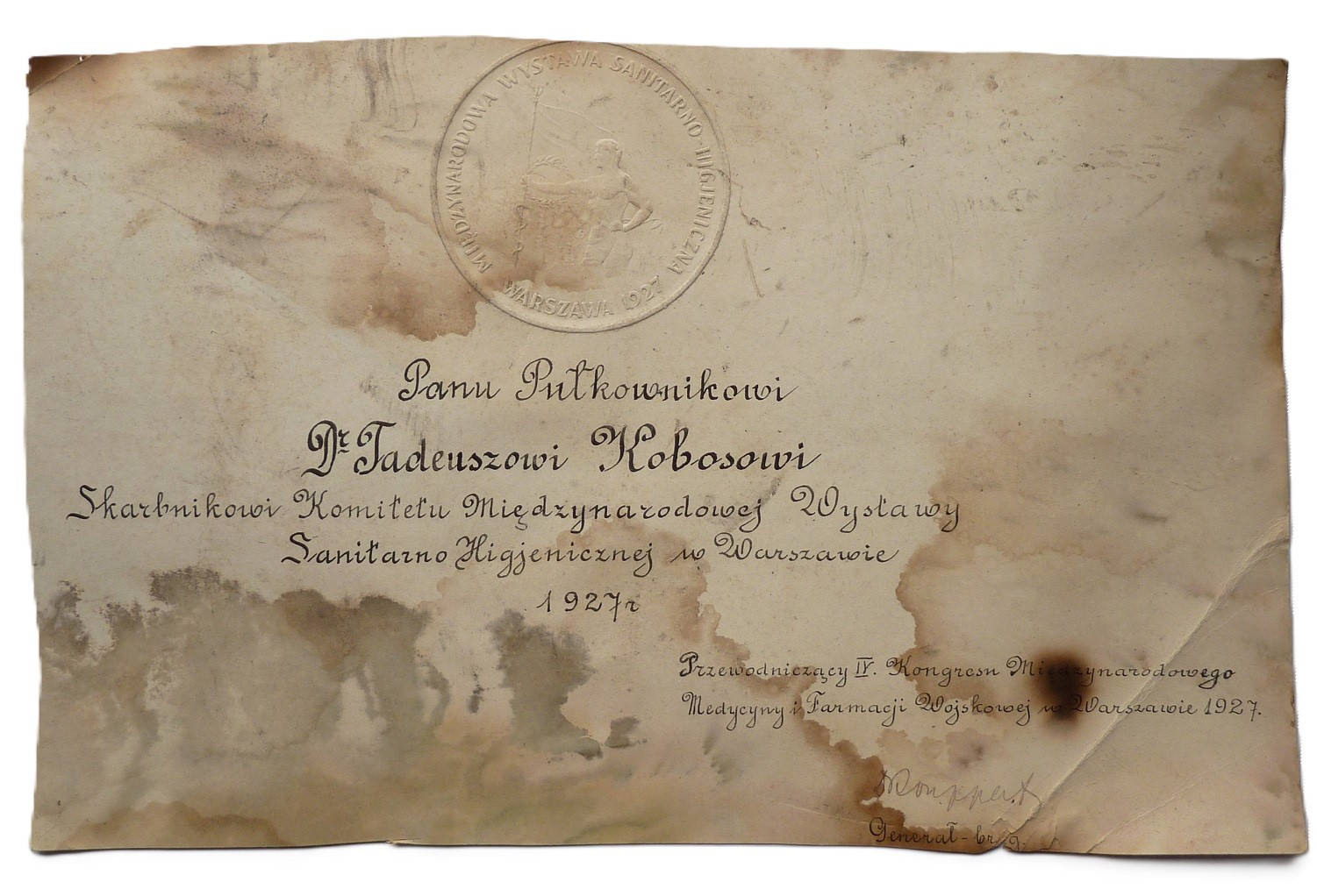 Wraz ze zdjęciami zakupiony został dyplom – podziękowanie dla płk. dr Tadeusza Kobosa, skarbnika Komitetu Wystawy Sanitarno-Higienicznej podpisany przez gen. Roupperta. Prawdopodobnie album ze zdjęciami był własnością dr T. Kobosa.
