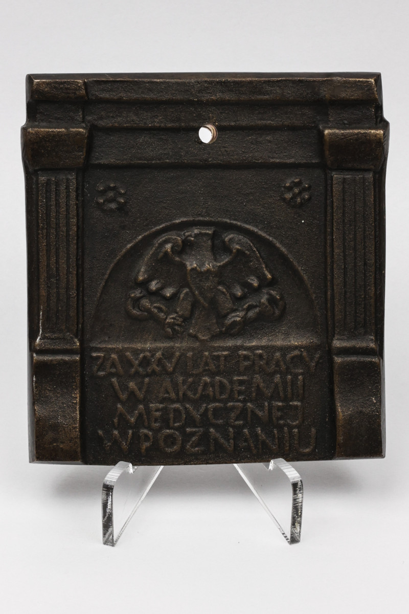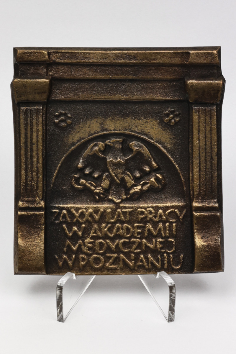 awers: pomiędzy dwoma kolumnami, w półkolu godło uczelni, poniżej napis: za XXV lat pracy w Akademii Medycznej w Poznaniu.