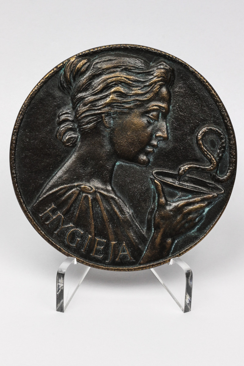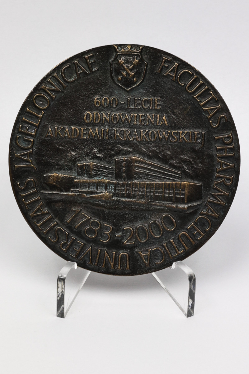 Pamiątkowy medal wydany z okazji 600. lecia odnowienia Akademii Krakowskiej Wydziału Farmaceutycznego 1783-2000; napis na obwodzie: ” Uniwersitatis Jagellonicae Facultas Pharmaceutica; rewres: wizerunek kobiety z czarą i napis Hygieja