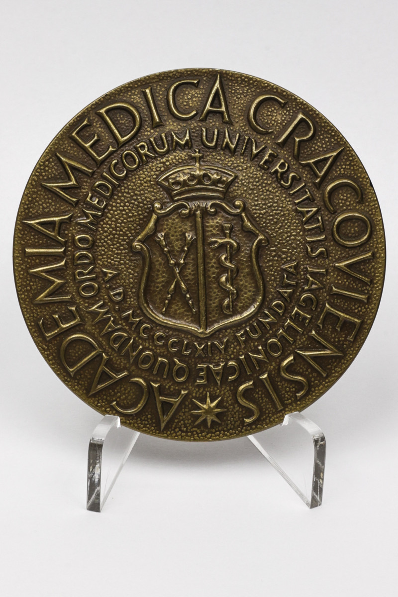 Awers: Academia Medica Cracoviensis Medicorum Universitatis Iagellonicae quondam ordo ad MCCCLXIV fundata (tł.: Akademia Medyczna Uniwersytetu Jagiellońskiego w Krakowie została założona w 1364 roku)