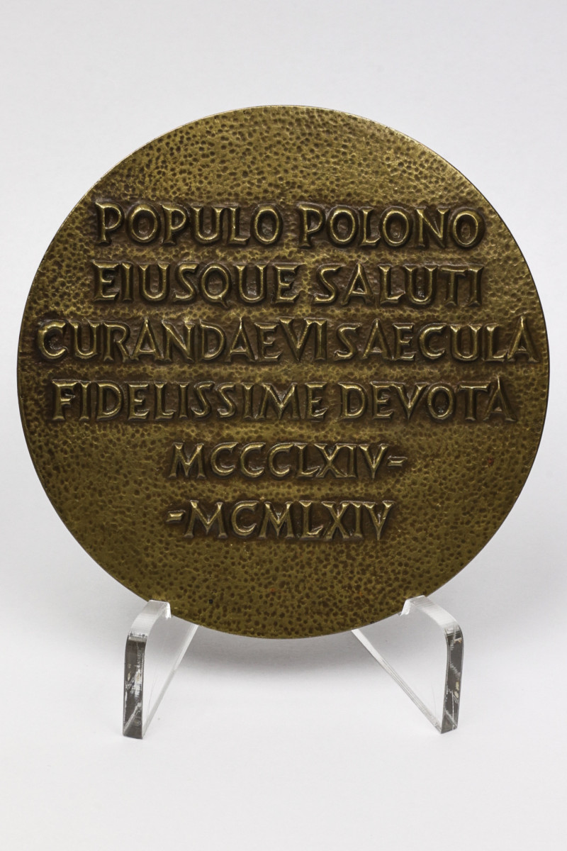 Rewers: Populo Polono Eiusque Saluti Curandae Visaecula Fidelissime Devota MCCCLXIV-MCMLXIV (tł.: Wiernie oddani narodowi polskiemu i ich zdrowiu 1364 – 1964)